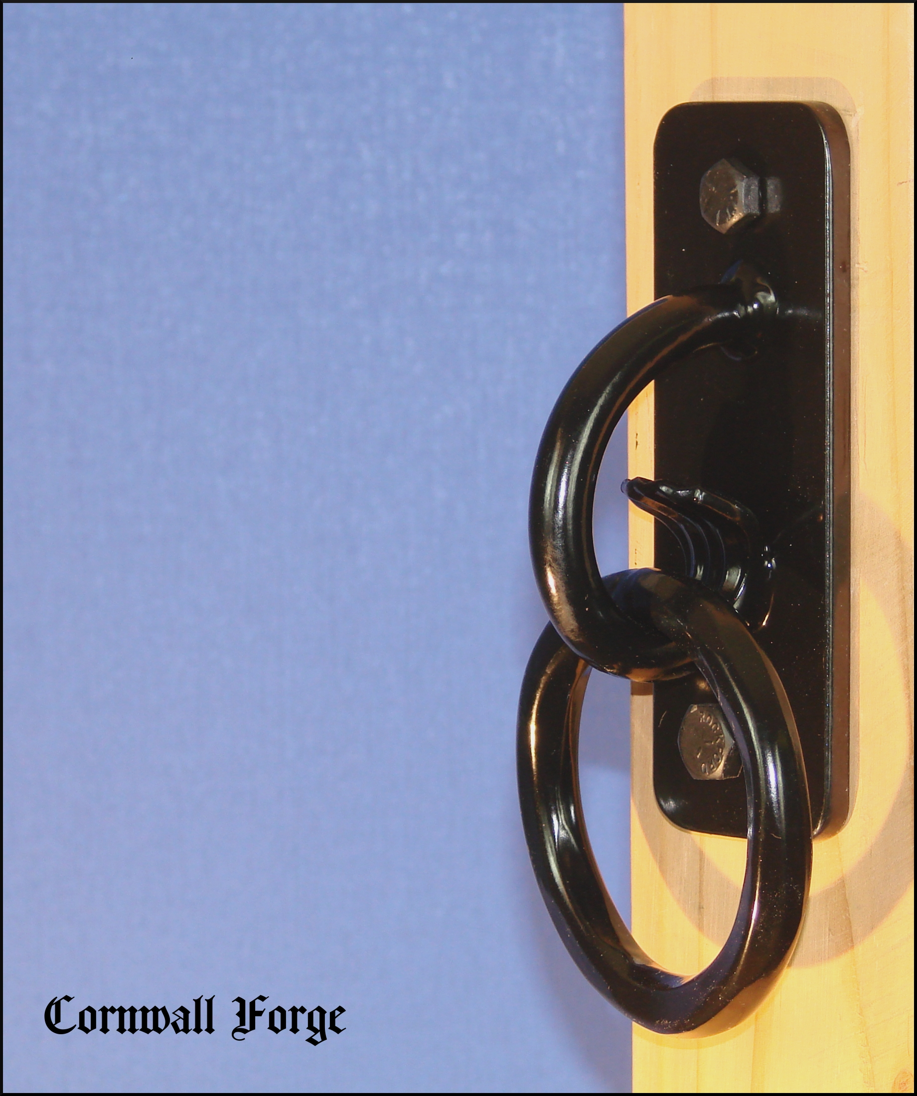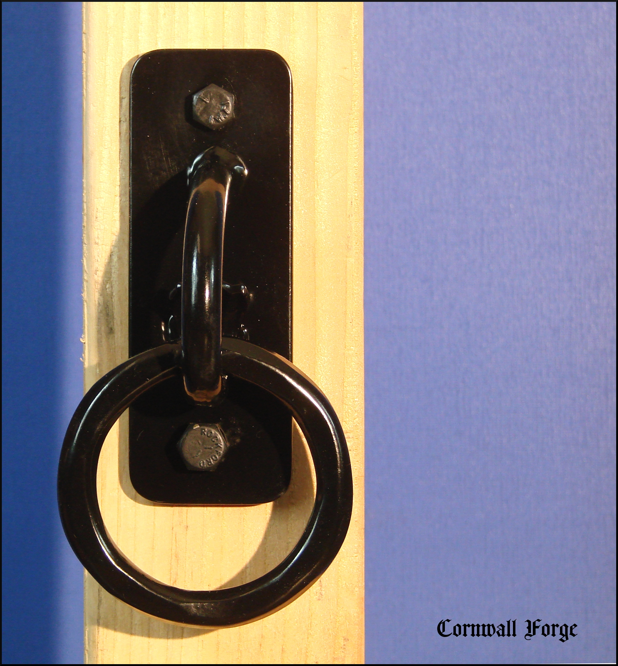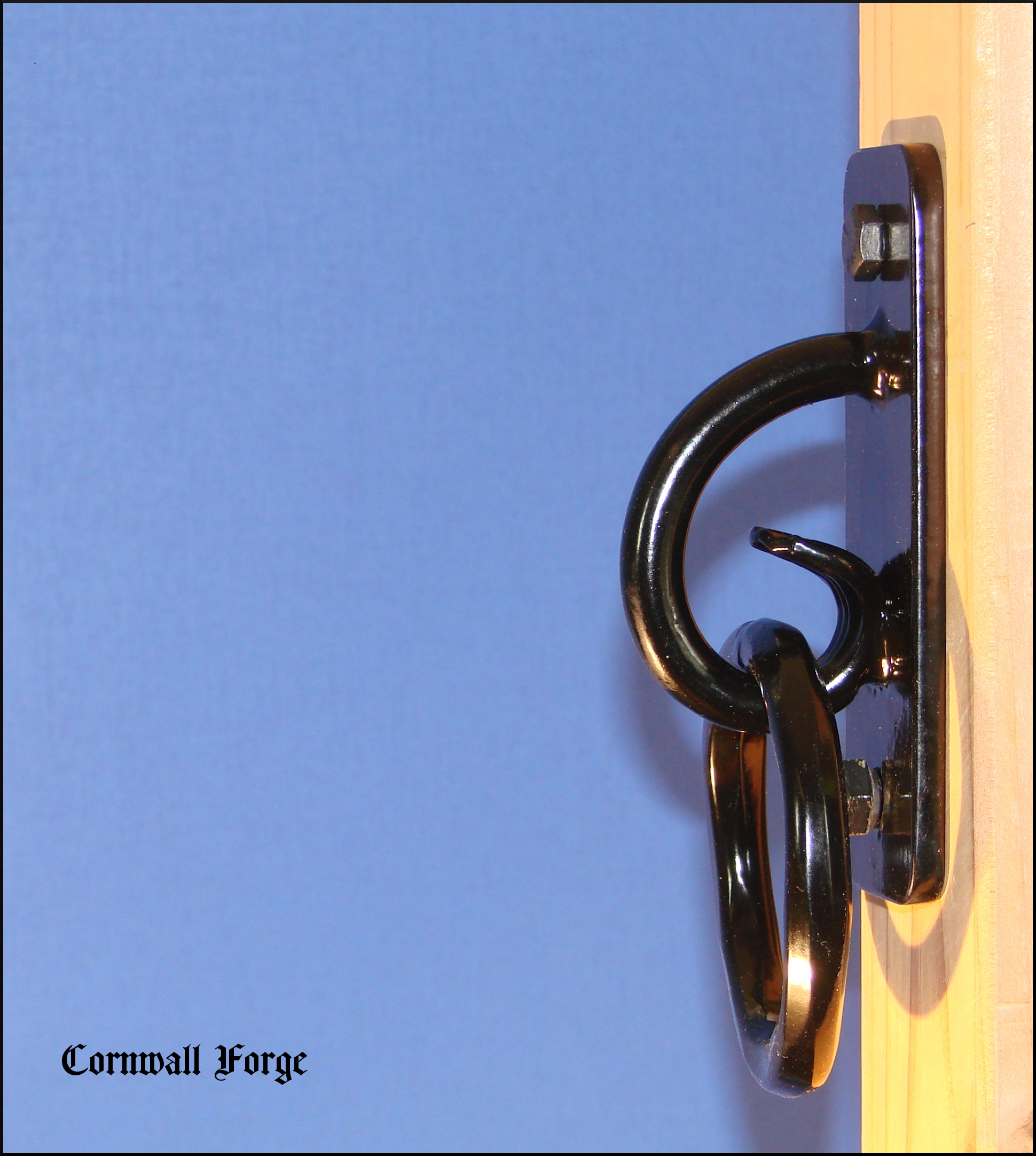 The 1/2 inch hammer forged steel ring is secured to the 1/2 inch steel base via a 1/2 inch round C-Scroll with a "fish tail" termination. Sand Blasted and professionally powder coated semi-gloss black, this item serves as a no-nonsense secure tie with an early American design. Made in Lancaster County,